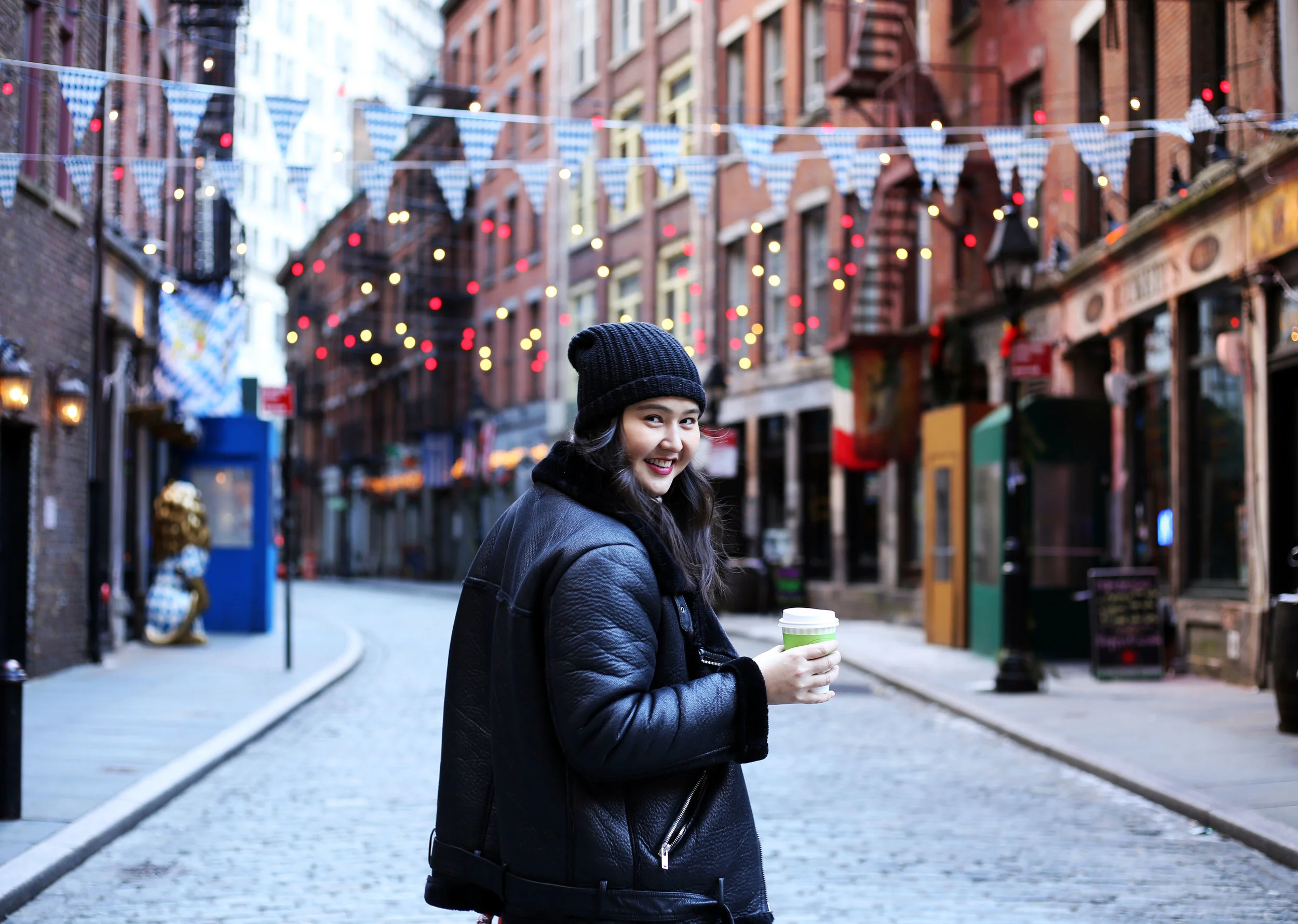 As I'm working in Downtown Manhattan, I'm becoming more familiar with every winding and extremely confusing streets down there. I've stumbled upon this one called Stone Street because it houses one of my favorite pizza places - Adrienne's. During the summer months, this block is popping, whilst in the winter it has this haunting ambiance. Taking a stroll down this street after a Sunday in the office on the way to the train, wearing amazing Everlane boots, aptly named the Boss Boot with my trusted Zara biker jacket and Jcrew bag. Here's to the weekend!